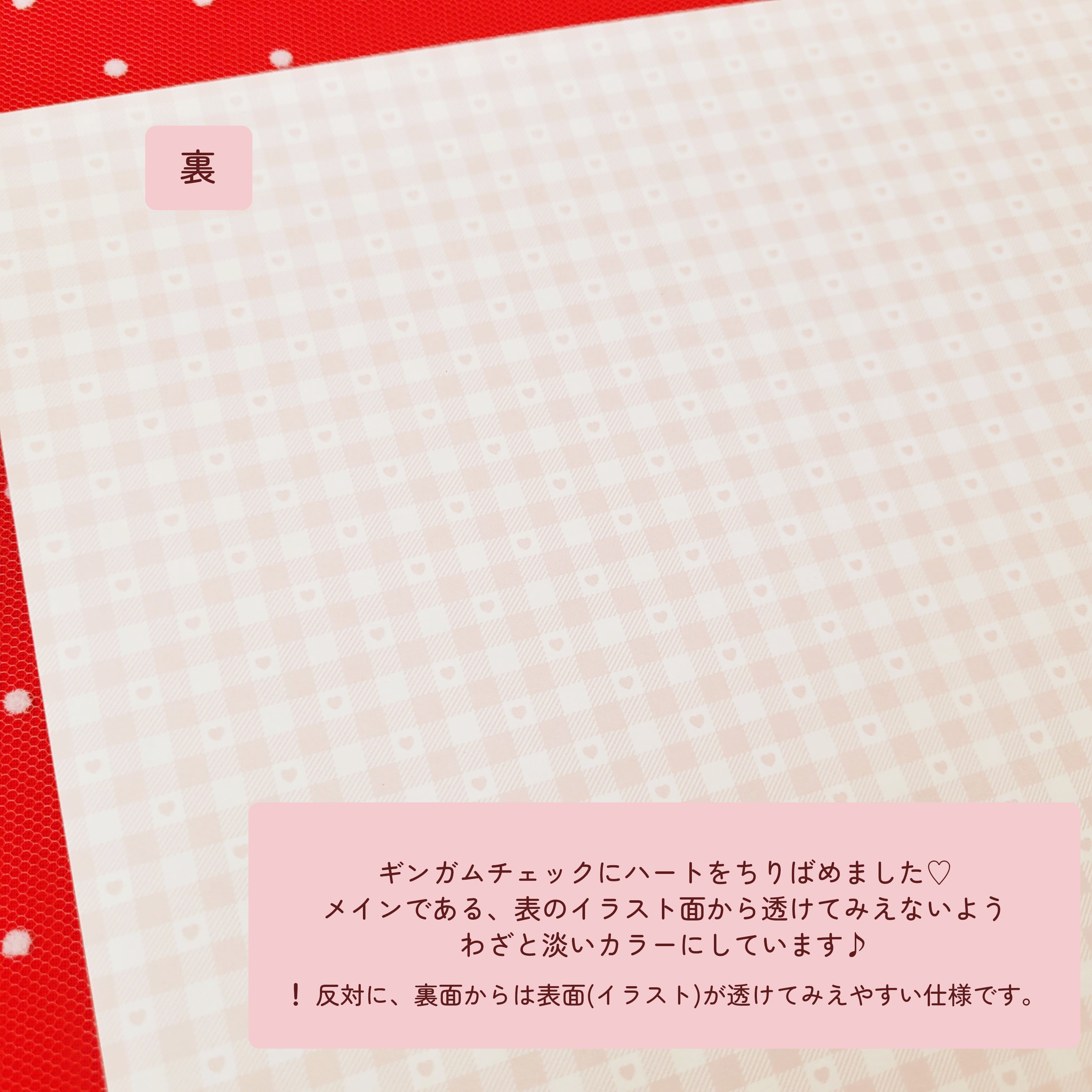 裏面にも淡いカラーでハートをちりばめたチェック柄を印刷しているので、